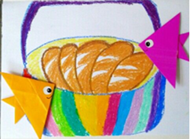 1. La primera actividad consiste en recrear esta canasta, dibujaremos los panes y haremos los peces en origami, como se muestra a continuación: