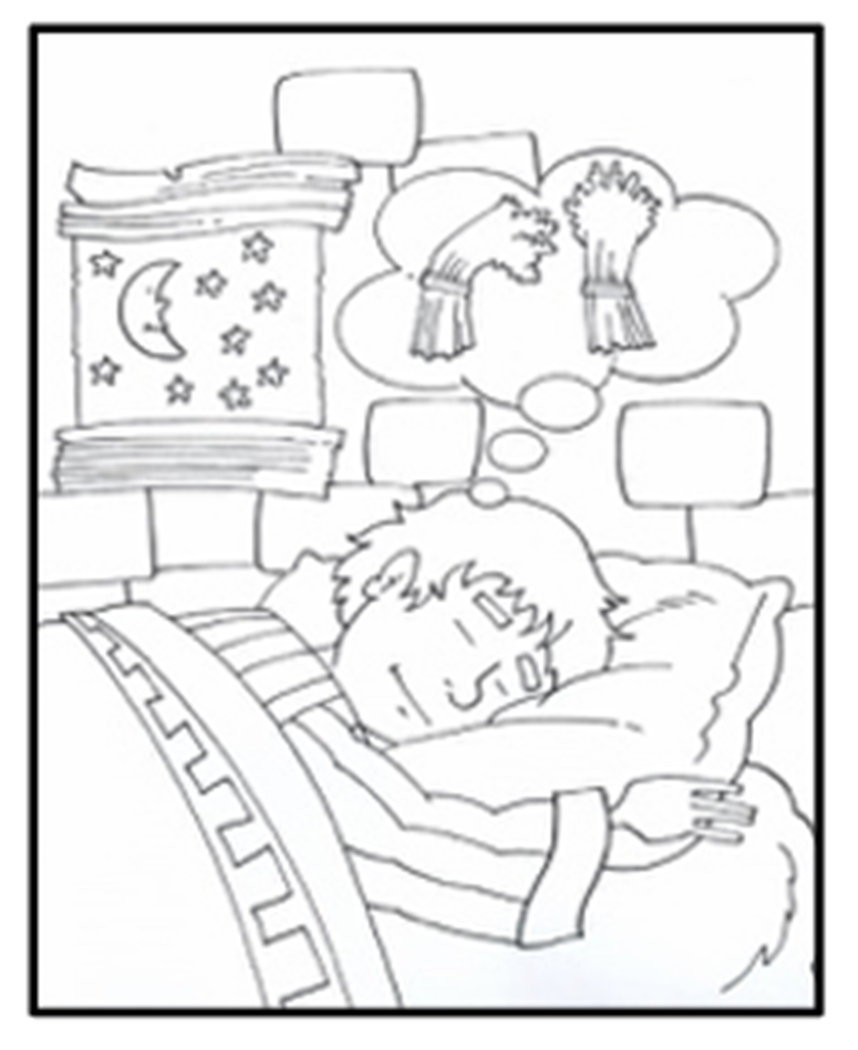 • Con anticipación consiga y coloque en el techo la luna, el Sol y las estrellas y la silueta de José durmiendo pegada en la pared. Y tener listo 11 manojos de heno en paletas y entregar a los niños, para mostrar la historia de los sueños de José.